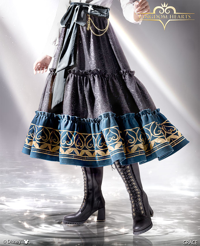 ベルトループには、物語を象徴する「キーブレード」のメタルチェーンが添えられた。揺れるたび、『キングダム ハーツ』の世界観を感じさせてくれる。裾のフリルには、「精神世界」を象徴するステングラスをイメージしたハートのデザインがラメプリントされていることも目を引く。スカートが動くたびにキラキラと輝く、豪華で幻想的な雰囲気に仕上げられた。