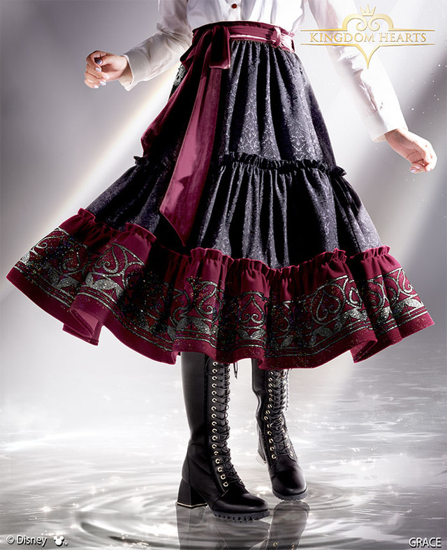 スカートが揺れるたび、ステンドグラスやキーブレードがきらびやかに輝き、『キングダム ハーツ』の世界が広がる。自然に広がるドレープ感で、ディズニーらしい夢の世界観を纏いながらも、ゴシックかつ華やかな雰囲気を楽しめる一着だ。