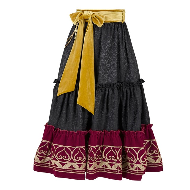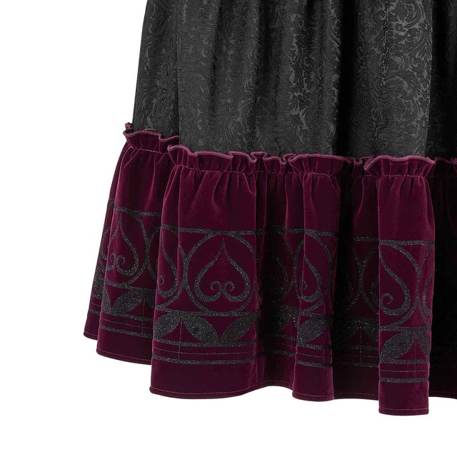 重厚なジャガー生地を贅沢に使っており、デザインにはさり気なくハート柄が施されている。自然に広がるドレープ感で、ゴシックかつ華やかな雰囲気を纏う。また、ウエストには高級感のあるベロアリボンが使用されている。クラシックかつエレガントな印象を与えつつ、各キャラクターのカラーリングがデザインの個性を引き立てる。