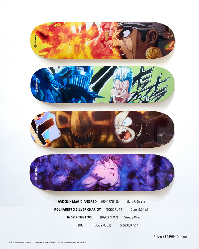 「スターダストクルセイダース」の世界観を、「ELEMENT SKATEBOARDS」の高品質なスケートボードに落とし込んだ。限定デッキは、空条承太郎、花京院典明、ジャン・ピエール・ポルナレフ、ジョセフ・ジョースター、モハメド・アヴドゥルなどの全8種。