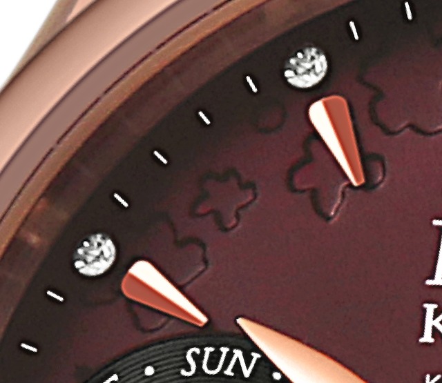 今回のアニバーサリーウォッチは、作中に登場する「梅の谷」に咲く梅の情景をモチーフにデザインされた特別仕様。梅の花芽をイメージしたインデックスには、装飾用のダイヤモンドが7石あしらわれている。