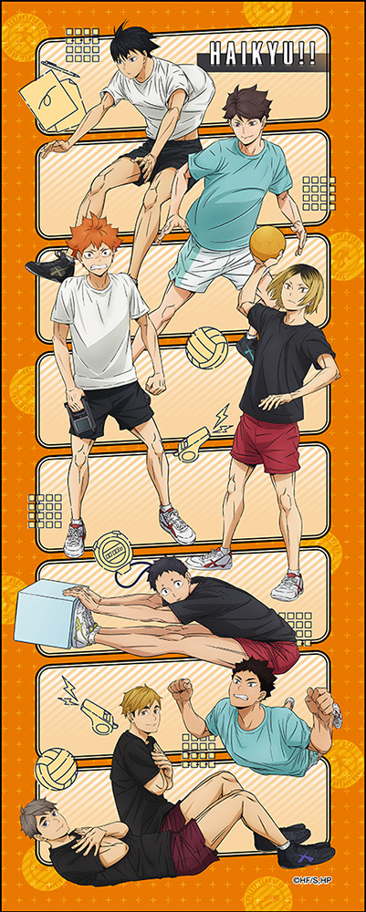 このたび「体力測定」がテーマの描き下ろしビジュアルを使用したグッズが登場。日向翔陽、影山飛雄、及川徹、岩泉一、孤爪研磨、福永招平、宮侑、宮治が体力測定を受ける様子の描き下ろしビジュアルが使用された。