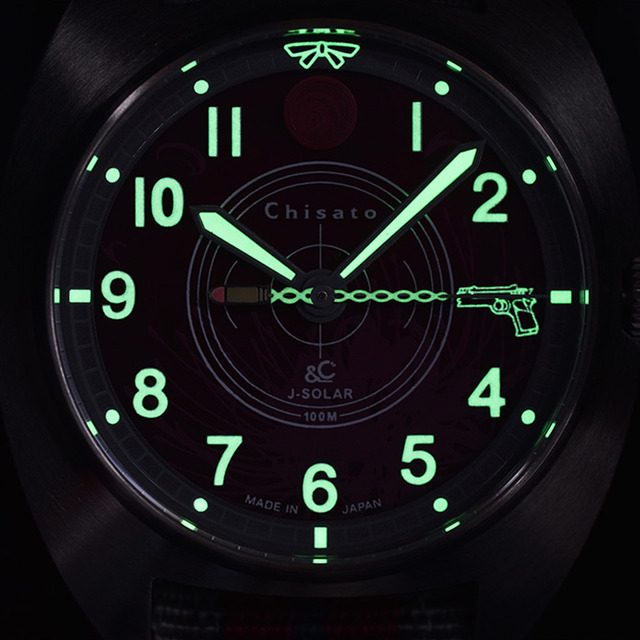 このほかムーブメントには、フル充電で最大4ヵ月駆動する日本製ソーラーモジュールが搭載され、電池交換は不要だ。強蓄光のインデックスと針は暗闇でも高い視認性を発揮し、さらに秒針が15秒を指すと、3時位置の銃口から放たれる弾丸の軌道が夜光で浮かび上がる特別なギミックも見どころとなる。高い実用性と遊び心を兼ね備え、『リコリス・リコイル』ファンの日常使いにもコレクションにも応えてくれるだろう。