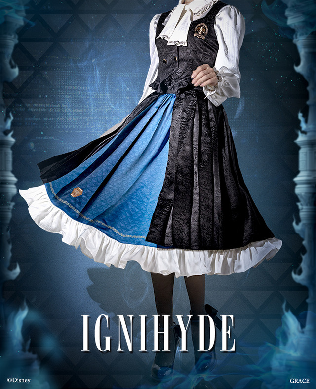 またスカート裾には寮ごとに、各キャラクターをイメージしたワッペンが全員分施されているのも見どころ。レイヤード上スカートはセンター部分が空いており、インナースカートが覗くデザインだ。