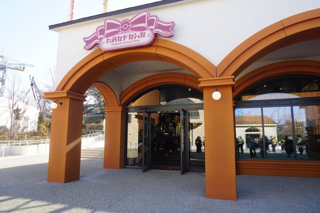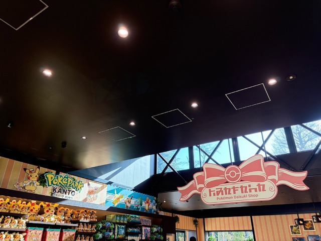 右手奥にあるのが、「ポケモンだいすきショップ」です。エリア内最大のお土産ショップで、ポケパーク内で身につけたいアイテムやお菓子、小物などポケモンの魅力たっぷりのお買いものが楽しめます。入場は整理券制となっています。今回はこちらにおじゃましました。