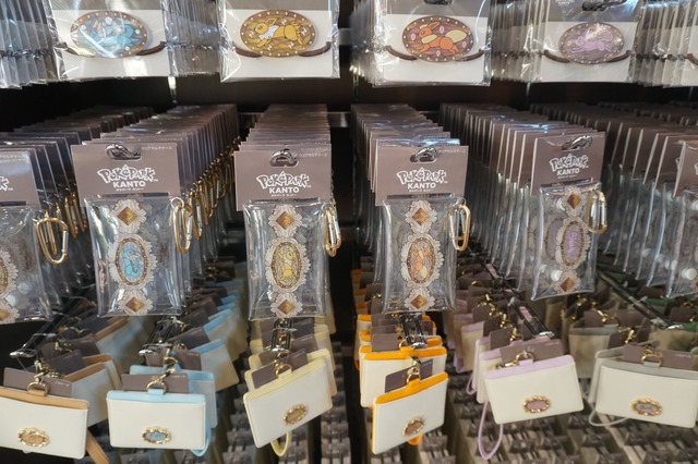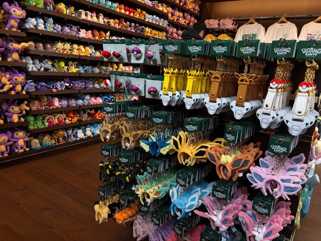 ショップの扉を開けると、スペシャルなカーニバル衣装でおめかししたピカチュウとイーブイが、とびきりキュートにお出迎え! そのかわいらしさに、思わず心が躍ります。緑のタグが付いた商品は、『ポケパーク カントー』オリジナルだとか。気をつけて見ていきましょう!