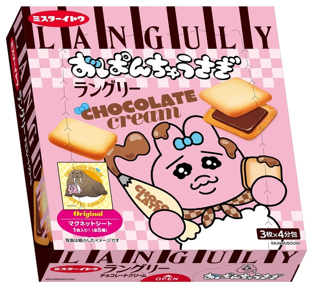ローソン店頭ではコラボ商品も展開する。「おぱんちゅうさぎラングリーチョコ12枚」(全1種/760円)は、ラングリーチョコのおぱんちゅうさぎ使用。特典としてマグネットシート(全5種)が1枚付属する。