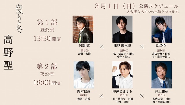 人気声優11名が日替わり出演する井上和彦の演出による舞台『朗読会四季シリーズ 冬 高野聖』は、2026年2月28日(土)・3月1日(日)に東京・品川プリンスホテル クラブeXにて4公演上演される。公演チケットは各種プレイガイドにて販売中。詳細は情報ページまで。