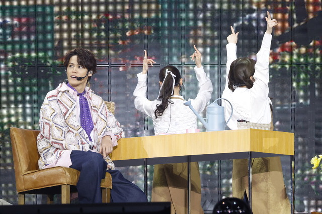 14日の公演で宮野が登場したのは、進行を垣花正アナウンサーにバトンタッチした最初の企画「フラワーショップ 噺の花束」から。前回の「バレイベ」から行われている同企画は、高城と百田が「姉妹」となり、2人が切り盛りする花屋にゲストを迎え、トークを展開するものだ。途中、“マジでイケてる宅配便”に扮した玉井や佐々木が登場する場面も見られた。