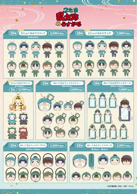先行商品も多数発売されることが告知されており、ラインナップには「むにゅぐるみマスコット」や「ジュエルポップシール」など計25種類の豊富なアイテムが展開。「むにゅぐるみマスコット」は、乱太郎、きり丸、しんべヱの一年生組と土井先生、そして映画でも活躍して人気を博している六年生組がラインナップ。ラスカルとの特別なコラボマスコットも必見。