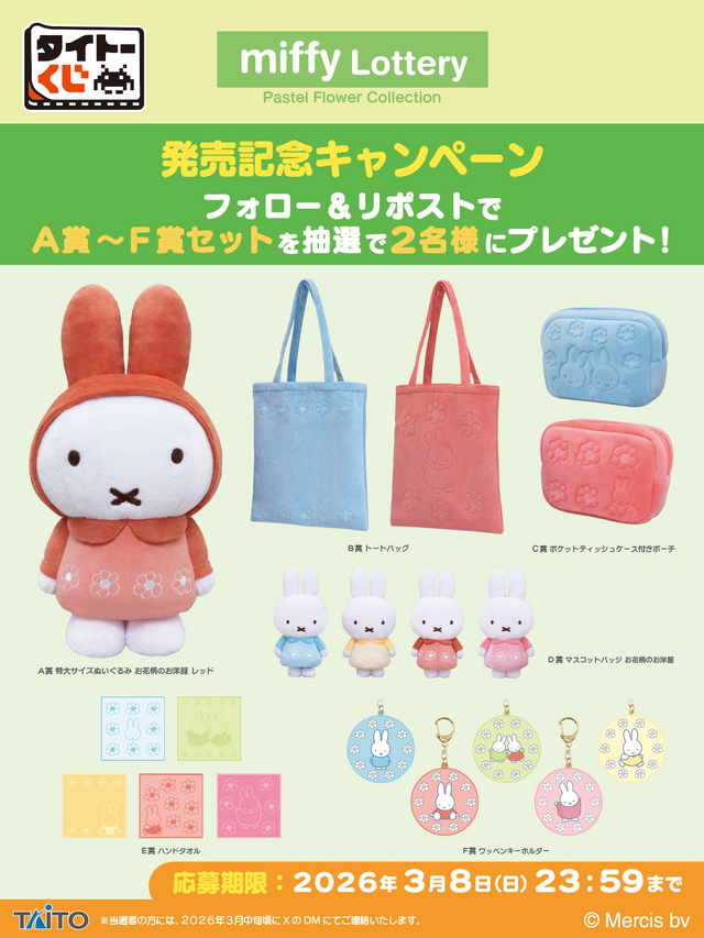 さらに「タイトーくじ ミッフィー Pastel Flower Collection」の発売を記念して、「A~F賞セット」を抽選で2名にプレゼントするキャンペーンも実施。
