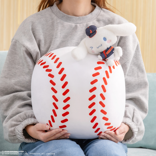 LH(ラストハッピー)賞は、野球ボールにちょこんと乗っているシナモロールがかわいいクッション。最後のくじを引くともらえるアイテムだ。