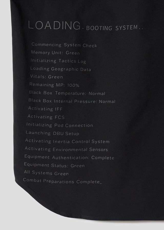 胸ポケットをポッドに見立て、ぶら下がり移動する2Bを刺繍した。ゲームのロード中に表示されるローディング画面が背面にラバープリントされている。