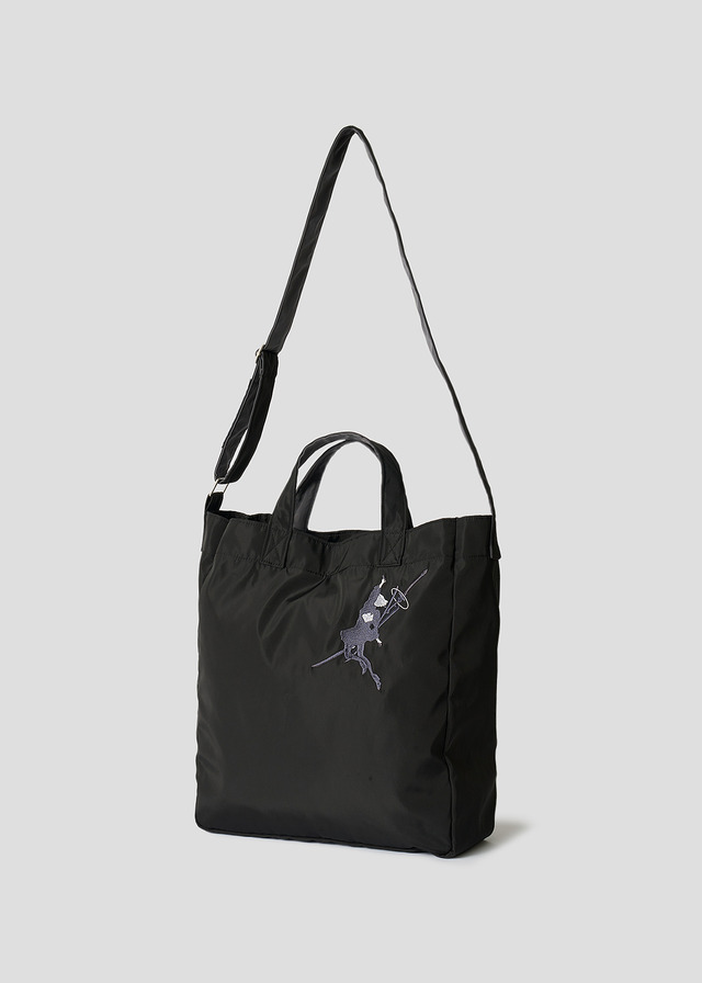 持ち手の縫い目をポッドに見立て、ぶら下がり移動する2Bを刺繍した2WAYトートバッグ。背面にはアンドロイド部隊「ヨルハ」のエンブレム、持ち手のサイドに「YoRHa」の織りネームもあり。