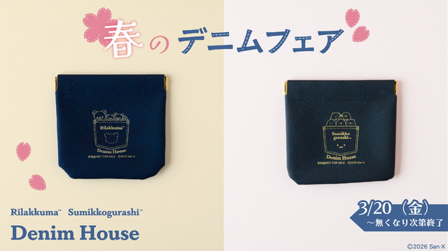「リラックマ」「すみっコぐらし」からオールデニムのアイテムが登場。3月下旬より「リラックマ・すみっコぐらし デニムハウス」にて発売される。ノベルティとしてオリジナルのスリムミニポーチも。