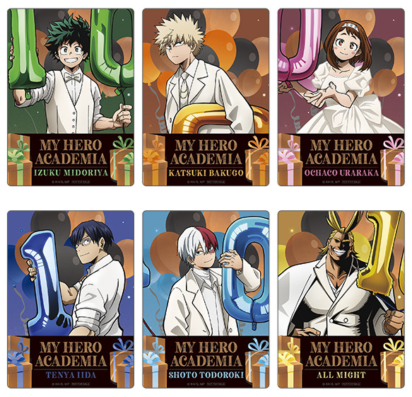 全国のアニメイトおよびアニメイト通販では、特典「アニバーサリーカード(全6種)」がもらえる「アニメ『僕のヒーローアカデミア』10周年スタートダッシュフェア」スタート。デクや爆豪などメインキャラクターたちがアニバーサリー仕様の衣装を着た特別なデザインとなっている。