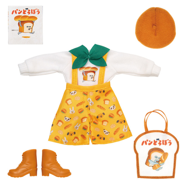 「パンどろぼうだいすきリカちゃん」は『パンどろぼう』の世界観を全身で表現。ブラウンのベレー帽、「パンどろぼう」がプリントされたトップス、パンの総柄キュロットなど、作品の温かい雰囲気を見事に落とし込んだ。