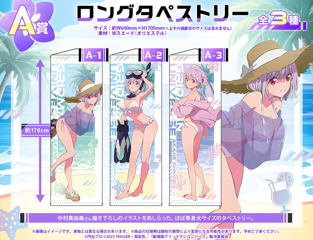2月20日に販売を開始した「『グリッドマン ユニバース』オンラインくじ 2026 feat.六花」と同じく本くじでも、『グリッドマン ユニバース』でサブキャラクターデザインを担当された中村真由美さんが“海辺の生活”をテーマに描き下ろしイラストを制作。描き下ろしイラストを使用したアイテムを中心に、アカネグッズのみで全22種類の賞品が展開されている。