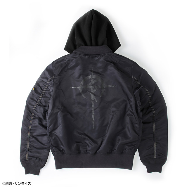 このたび販売されるのは、ミリタリーブランド「ALPHA INDUSTRIES(アルファインダストリーズ)」とのコラボアイテム「STRICT-G ALPHA『機動戦士ガンダム 閃光のハサウェイ キルケーの魔女』LIGHT MA-1 NATUSハサウェイ・ノア」。MA-1ジャケットの中綿を取り除いたライトゾーン用のフライトジャケットL-2B(軽量でオールシーズン着回せるLIGHT MA-1)をベースに、着脱可能な仕様のフードを施し現代風のスタイリングに合わせてデザインした、すっきりしたシルエットとなっている。