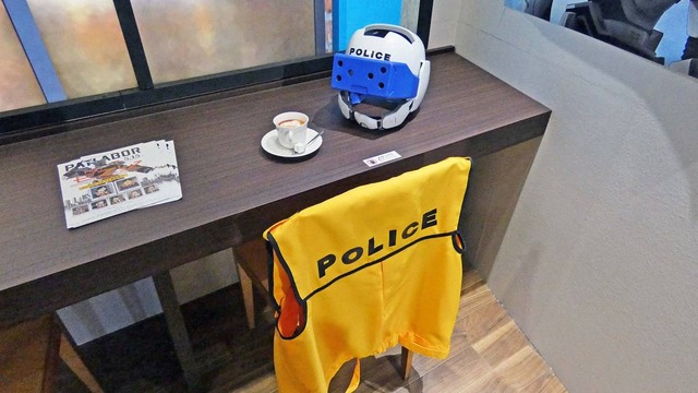 たとえば高橋留美子さん原作の『MAO』はタイムスリップミステリーということでレトロなカフェを、『機動警察パトレイバーEZY』は特車二課のジャケットやレイバー搭乗時のヘルメットが喫茶店のセットに備えられていたほか、『機動警察パトレイバーEZY』に登場するイングラム・プラスの立像がディスプレイされていました。