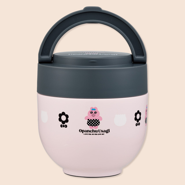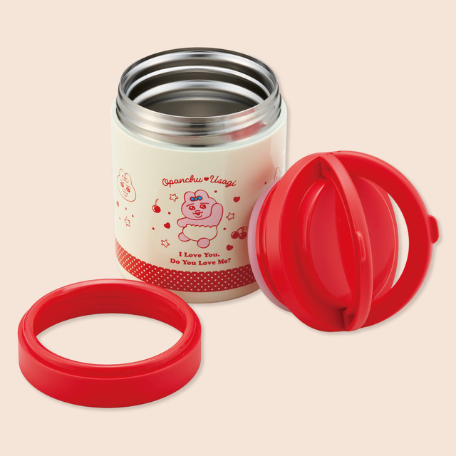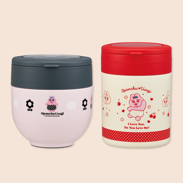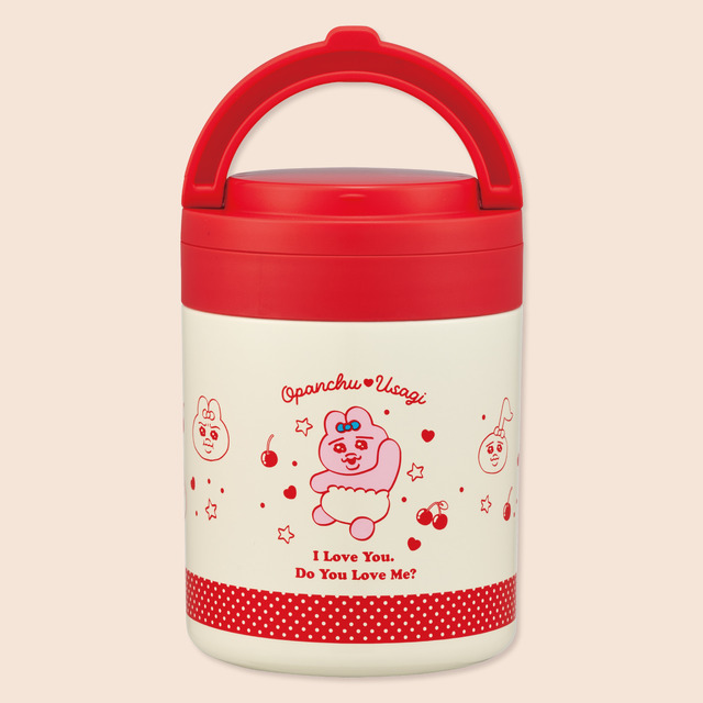 「デリカポット」は、スープ、カレー、シチューなどの汁物から、冷たいサラダやフルーツまで幅広く使える。容量はたっぷり入る500ml。アイボリーと赤を基調に、サクランボや「おぱんちゅうさぎ」のイラストをあしらった、レトロでポップなデザインがランチタイムを明るく彩る。