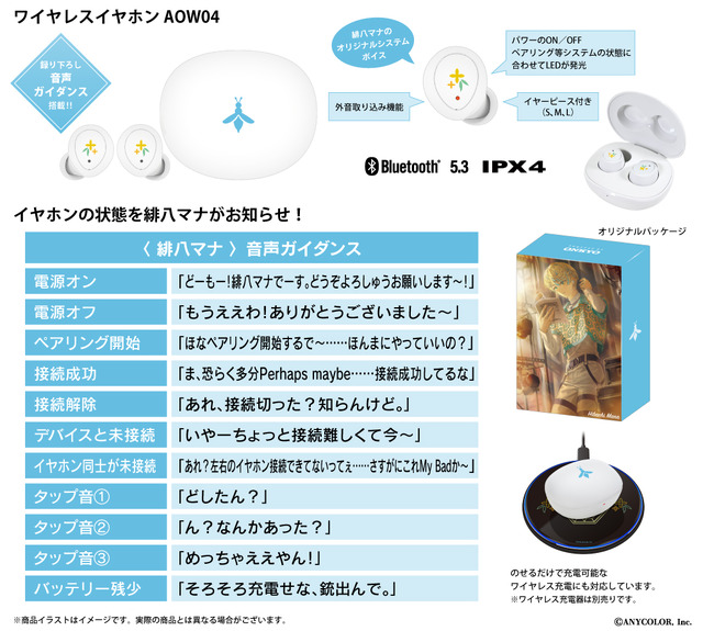 本コラボレーションモデルは、緋八マナと赤城ウェンをイメージした各デザインを左右のイヤホンや充電ケースにあしらい、白を基調としたシンプルで普段使いができるデザインに。完全録り下ろし(全11ワード)のボイスが内蔵された。