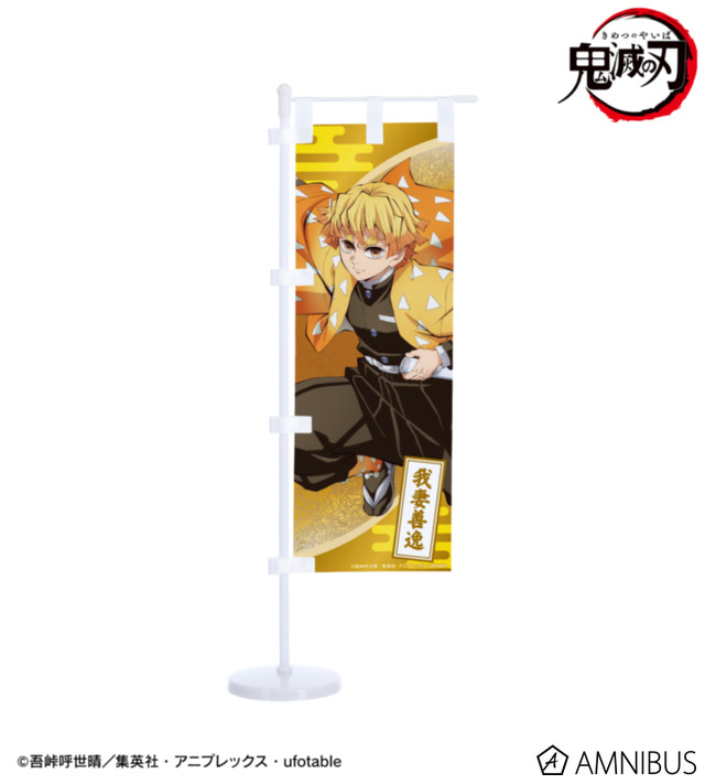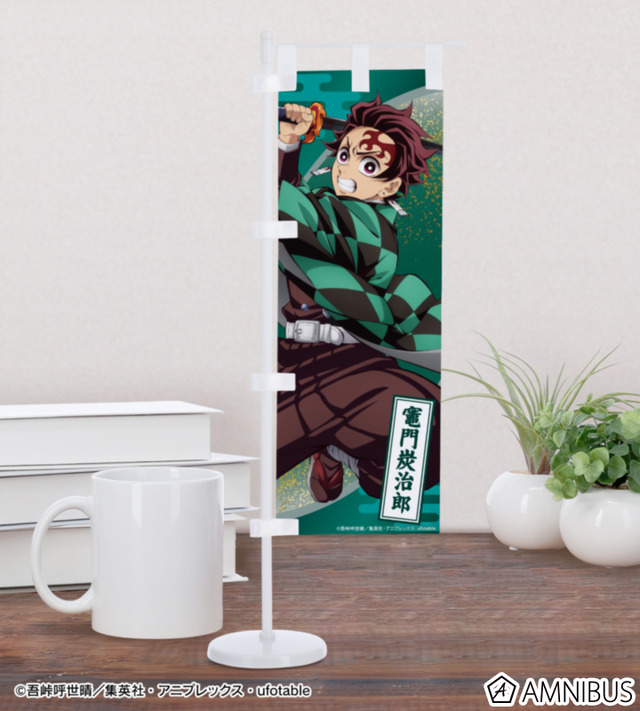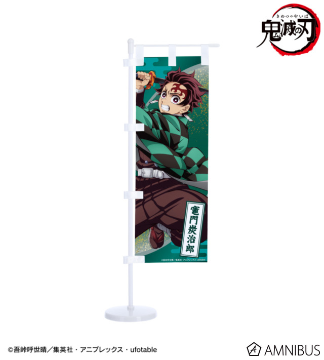 「ミニのぼり」は、竈門炭治郎、我妻善逸、冨岡義勇、胡蝶しのぶ、猗窩座のイラストをミニサイズののぼりに仕上げられたアイテムだ。付属の台座は組み立て式のため、飾って楽しんだり、分解してイベントなどへ持ち運ぶことも可能。
