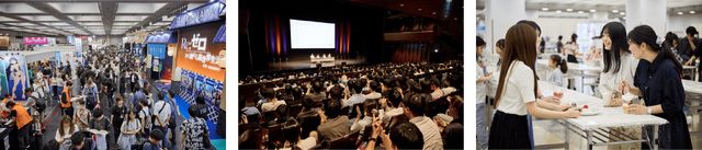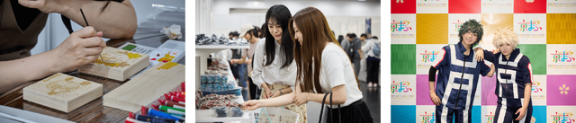 京まふ2025の様子(左から:伝統工芸体験工房、京まふショップ、コスプレエリアの様子)