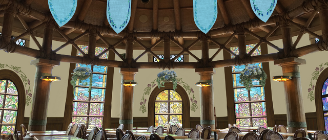 旅人となって、冒険に思いを馳せながら『葬送のフリーレン』の世界にひたることができるレストラン。店内には、これまでの旅の思い出をちりばめたステンドグラス調の窓が広がり、まるでフリーレンたちと同じ空間にいるような感覚で食事を楽しめる。