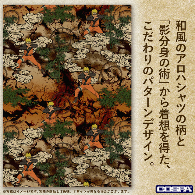 本商品はTVアニメ『NARUTO-ナルト- 疾風伝』より、和風のアロハシャツの柄と「影分身の術」から着想を得た、こだわりのパターンデザインのアロハシャツ。