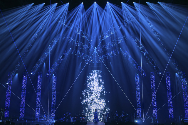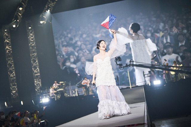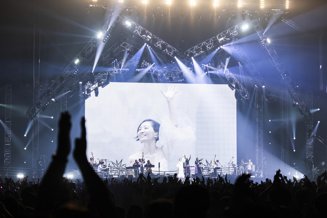 最初のMCでは「こんなにいっぱいの人の前で歌うとか、どうかしてる~!」と笑顔で率直な言葉を口にし、集まった観客みんなを笑顔にした。そして「ずっと前から私のことを応援してくださっている方も、今日初めて私のことを知ってくれた人も置いてけぼりにしない優しいライブにしたいと思います!」と宣誓。オープニングで着用していたアイボリーのジャケットからブルー系の美しいドレスに衣装チェンジすると、パープルの薄いベールに包まれたような照明の中で「紅茶」をしっとりと、でも清涼感たっぷりに歌い上げた。バンドのカオティックなセッションも見事だったのは「birds」で、狂おしくヒリヒリとした感情を伸びやかに歌い上げる姿が圧巻だった。有明アリーナの大きな会場で1曲ごとに異なるドラマを生み出していく様は、やはり30年というキャリアの成せる技。「声出してくれるかな?」と会場にマイクを向けた「Drops」ではみんなが心の叫びを歌に乗せ、この日だけの音楽が完成した。