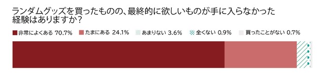回答者の多くはランダムグッズの購入経験が豊富であり、直近2年間の間にも購入している実態から、ランダムグッズを「嫌いと感じながら購入している」消費者が非常に多いという状況が見て取れる。