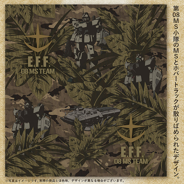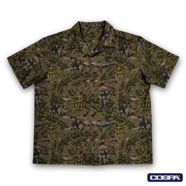 アロハの柄は第08MS小隊のMS(モビルスーツ)とホバートラックが散りばめられた、第08MS小隊ファンの心を掴むデザイン。接触冷感生地が採用されており、劇中のような高温多湿な環境でも快適に過ごせる。
