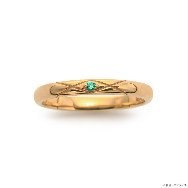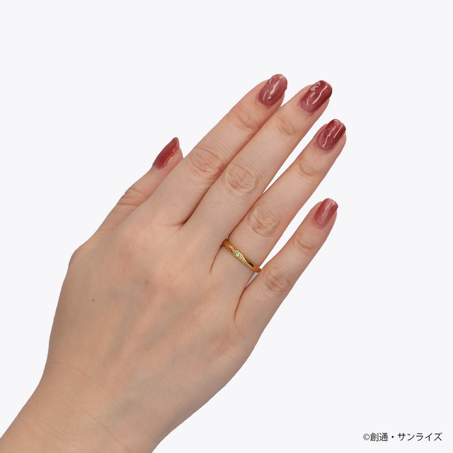 ハサウェイ・ノアをイメージしたシルバーリングは、パイロットスーツをモチーフに取り込んだV字デザインに、イメージカラーストーンをセット。内側にはΞ(クスィー)ガンダムマークと名前の刻印が施されている。