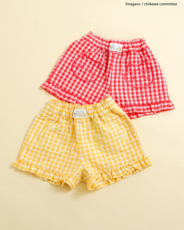 「ギンガムショートパンツ」は、夏にぴったりなギンガムチェックが映えるアイテム。大きなアニメちいかわのデザインがポイントだ。