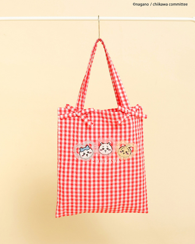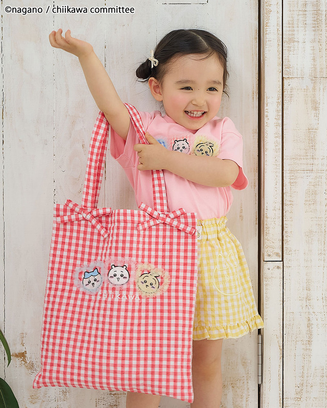 「フリルトートバッグ」は、赤チェックに大きなリボンで、写真映えバツグンのトートバッグ。おでかけにぴったりな、かわいさ満点アイテム。親子で使えるトートバッグだ。