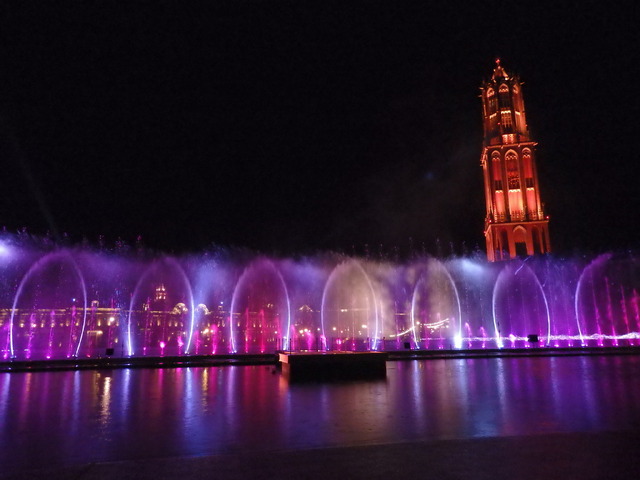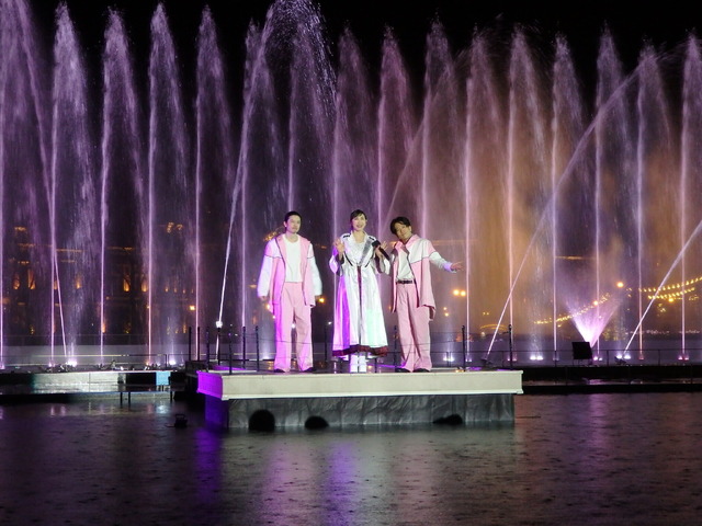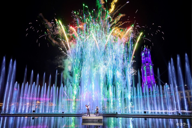 ショーは、ヨーロッパの街並みとシンボルタワーであるドムトールンを背景に、『エヴァ』カラーを意識した光の演出や最大高さ20mを誇る迫力の噴水によるきらびやかな絶景。音楽は『エヴァ』の劇中歌でおなじみのクラシックが使用され、ショーをより壮大なスケールに感じさせる。
