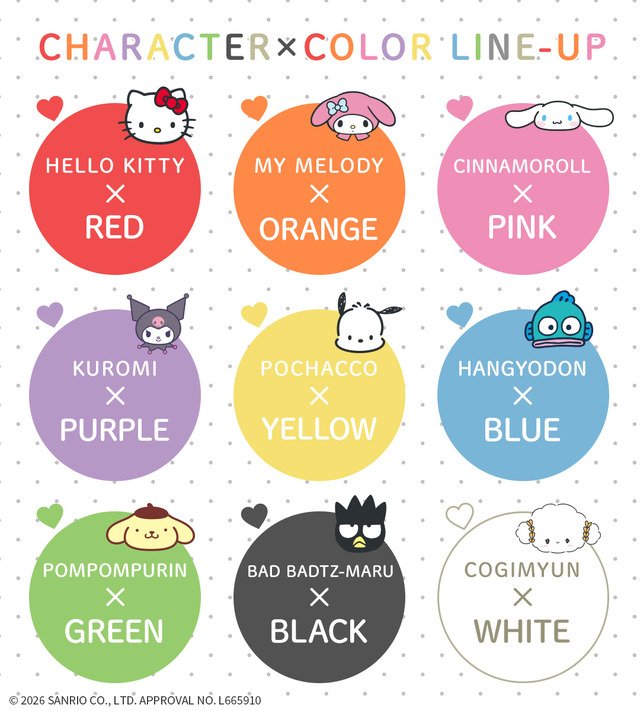 普段使いはもちろん、イベントやライブなどの推し活、遠征にもぴったりの新アイテム。ハローキティ、マイメロディ、シナモロール、クロミ、ポチャッコ、ハンギョドン、ポムポムプリン、バッドバツ丸、こぎみゅんの9キャラクターがラインナップされている。