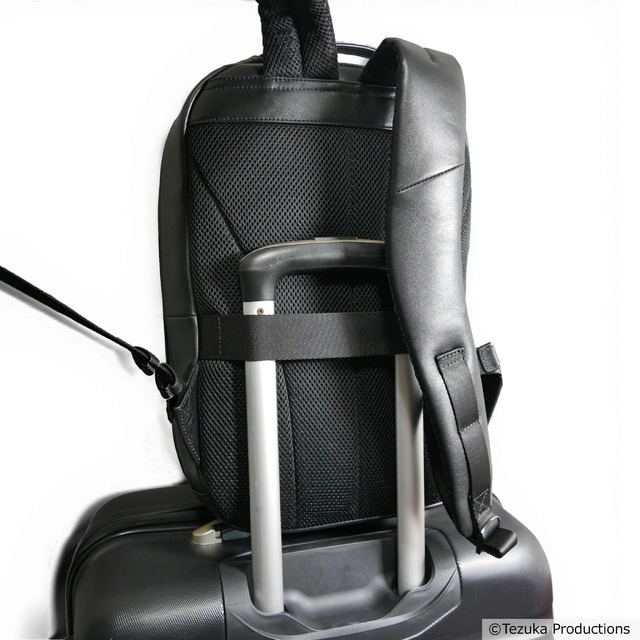 スーツケースに固定できるキャリーオン仕様。背面にはナイロンストラップを備え、出張や移動時にも安定して持ち運べる。