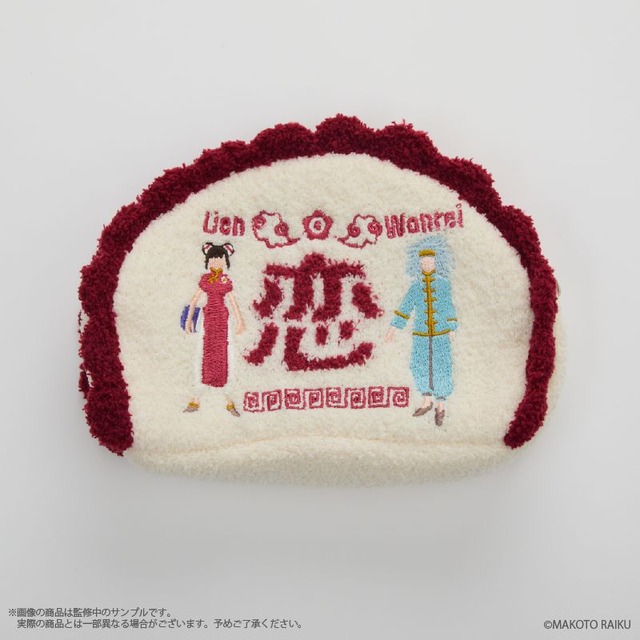 「ビクトリームのメロン型ポーチ」は、あの圧倒的なメロン愛がそのままポーチに閉じ込められた。ビクトリームの顔がジャガードで大胆に表現され、ひと目で伝わるインパクトを誇る。裏面にはしっかりメロン柄もあしらわれている。「ウォンレイとリィエンの恋ポーチ」は、ふたりの絆を象徴する「恋」の文字があしらわれた、キャッチーな中華風デザインだ。