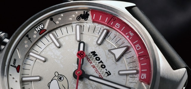 インデックスには、走行中でも時刻を判別しやすいバーインデックスを採用。12時位置のみナビゲーションマーカーをモチーフとした形状とすることで、バイ走行中でも瞬時に12時位置を認識できるレイアウトとしている。また、秒針には終末ツーリングを象徴するつーりんぐらむのロゴをデザインし、機能性を重視した文字盤の中に、作品性を感じさせる要素をさりげなく取り入れている。