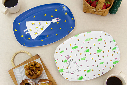 世代を超えて愛され続けている絵本『わたしのワンピース』のメラミントレーです。絵本の中から2場面、お花畑柄と星空柄のワンピースを着たうさぎさんが、トレーのデザインになっています。