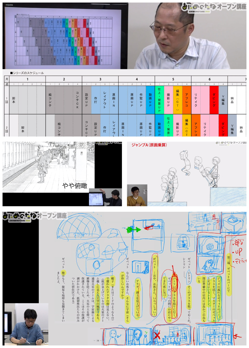 令和3年度の本事業では、以下3つの人材育成を実施し、手法・過程を含めた成果に対して、外部有識者の協力を得て評価を行うとともに、アニメーター・制作進行等の育成方法に関して検討・分析を行い、アニメーション業界並びに教育機関における効果的な人材育成方法等の情報共有、普及を行います。
